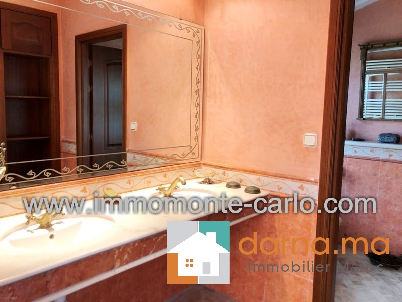 Rez de chaussée : une grande réception comprenant un salon européen salon marocain salon avec cheminée, salle à manger, salle d’eau des invités avec double vasque, un séjour terrasse donnant sur la piscine et le jardin et une chambre d’amis avec sa salle de bain et dressing, grande cuisine bien équipée,